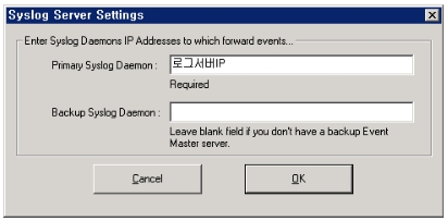 아래 “로그서버IP”부분은 SULog Server의 IP 주소를 넣어 주시기 바랍니다.