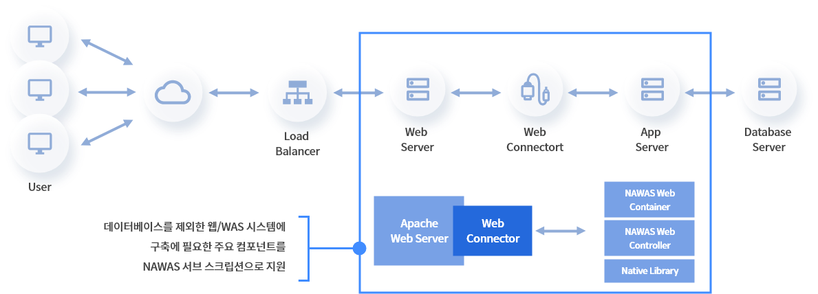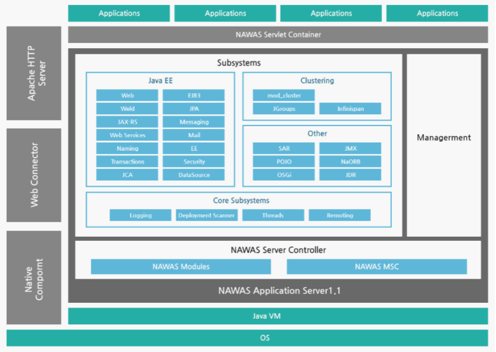 SUWAS는 웹서버인 Apache HTTP Server, Servlet Container와의 연결을 위한 Web Connector, APR API를 이용한 Native 커넥터 집합인 Native 컴포넌트, SUWAS 서블릿 컨테이너, SUWAS Subsystem으로구성됩니다.